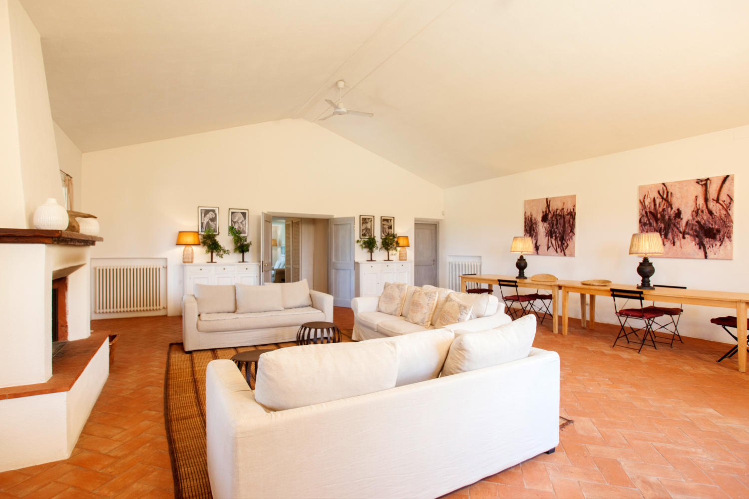 The living room has a large dining table, wide white sofas and a fireplace: you’ll notice a cast-iron wild boar in the fireplace, which is meant to protect the guests from the fire’s intense heat. The outdoor patio is covered with a stunning American vine that turns red in autumn. The patio has comfortable sofas, armchairs full of cushions and a beautiful table for lunches and dinners in the open air and where you can have a chat sipping good Tuscan wine.