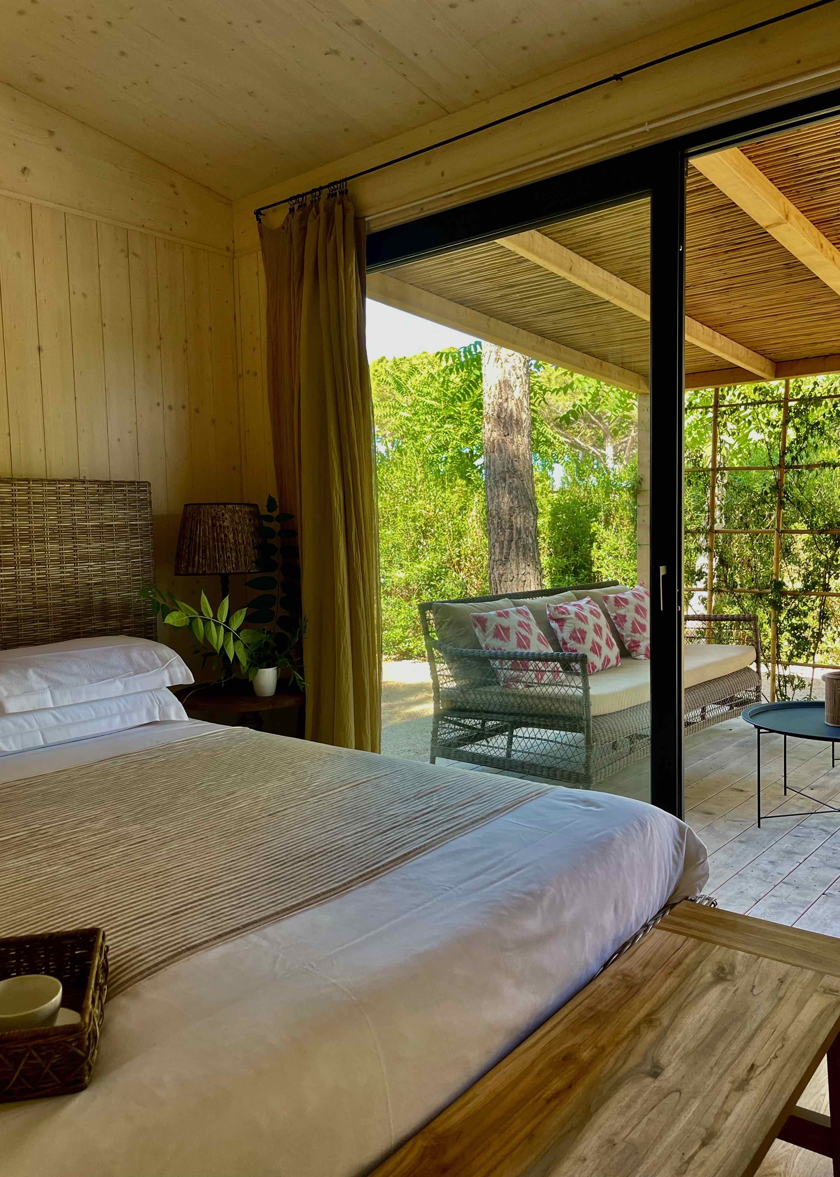 The Glamping Wooden lodges are completely new structures designed for your relaxation and to enjoy the surrounding nature. The fabrics, materials, and colors of the interiors of the Glamping Wooden lodges are studied to be in harmony with the territory, the sea, and the beach, making your vacation natural and exclusive at the same time.