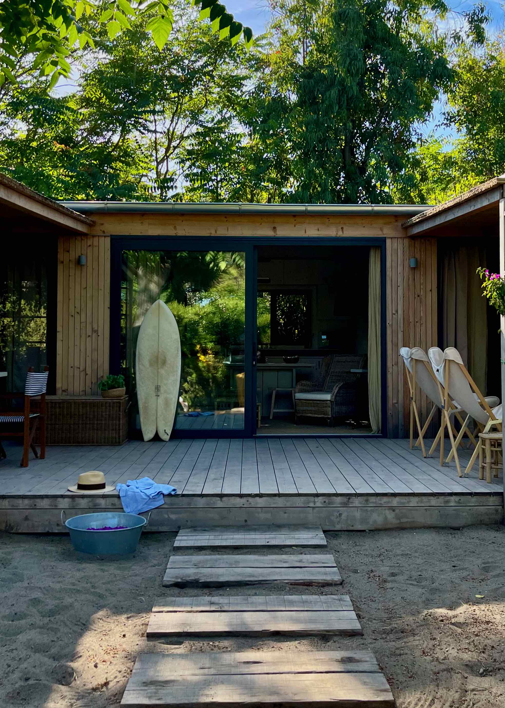 In addition to the bathtub, each Wooden Lodge has an outdoor shower for cooling off after a day at the beach. You will also find a spacious outdoor deck, furnished with comfortable sofas, a table, and chairs for organizing family meals, sunset aperitifs, and endless evening dinners.